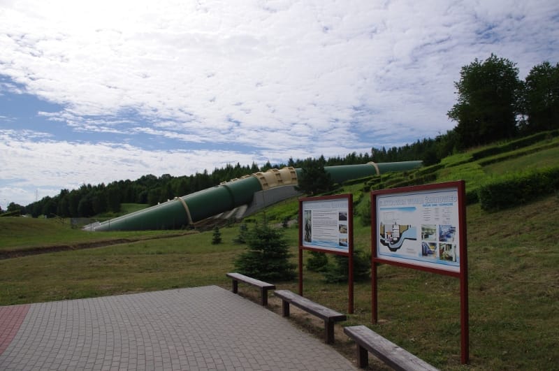 Ale niewiele osób wie, że Żarnowiec ma już jedną, działającą i to bardzo słynną elektrownie wodną. Jest to tak zwana elektrownia odpływowo-pompowa, największa tego typu w Polsce. Jest dość nietypowa, jeśli oczekujesz czegoś w rodzaju tego co widziałeś w Solinie czy Rożnowie. Tu nie ma spiętrzenia wody, która potem wpada na turbiny wytwarzające prąd. Elektrownia umiejscowiona przy sztucznie wybudowanym kanale na południowym brzegu Jeziora Żarnowieckiego. Posiada cztery turbiny, które mogą pracować w dwóch kierunkach. Na okolicznej górze umiejscowiony jest drugi, całkowicie sztuczny, zbiornik wodny o powierzchni 135 hektarów. Zbiornik połączony jest z elektrownią za pomocą czterech ogromnych rur o średnicy około sześciu metrów. Gdy w krajowej sieci energetycznej występuje nadwyżka prądu, wtedy cztery turbiny znajdujące się w elektrowni pobierają prąd i pompują za pomocą ogromnych rur wodę z jeziora do górnego zbiornika. Gdy wymagana jest dostawa prądu do sieci krajowej, wtedy z górnego zbiornika spuszczana jest woda ogromnymi rurami i te same turbiny wytwarzają prąd oddawany do ogólnokrajowej instalacji. Tak naprawdę to ta elektrownia działa jak gigantyczny akumulator, który magazynuje lub oddaje zgromadzoną energię do sieci. Na górnym zbiorniku różnica poziomów może sięgać szesnastu metrów, na jeziorze ten skok może wynieść nawet metr. Linia energetyczna doprowadzona do elektrowni jest potężna. Elektrownia składa się z czterech niezależnych od siebie zespołów. Gdy wszyskie pracują jako pompy wtedy pobierają 800 MW. Gdy wszystkie pracują jako generatory wtedy mają moc 700MW. Sterowanie odbywa się zdalnie, pulpit sterowniczy znajduje się w Warszawie w Krajowej Dyspozycji Mocy.